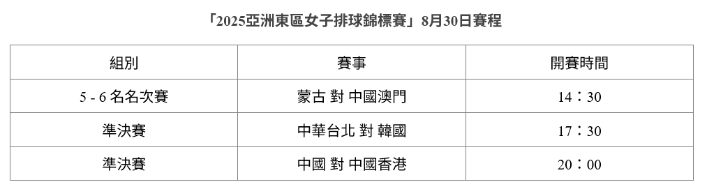8月30日亚洲东区女排锦标赛赛程安排情况如下:5-6名次赛(下午14:30)蒙古vs中国澳门、半决赛1(下午17:30)中华台北vs韩国、半决赛2(晚上20:00)中国vs中国香港。
